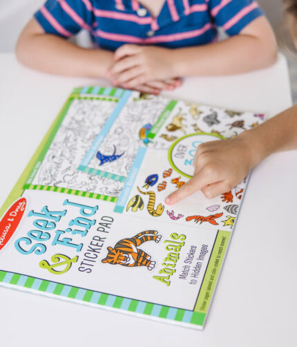 A 21-page seek-and-find sticker pad filled with colorful stickers and animal-themed stories for kids aged 4 to 7.