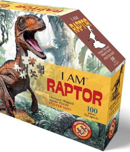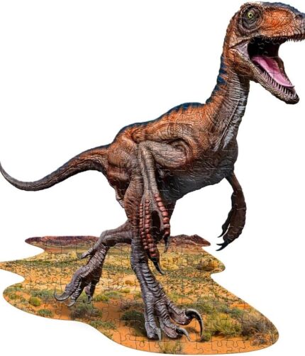 Unique dinosaur-shaped jigsaw puzzle with educational insert. 100 oversized pieces for easy handling. Perfect for ages 6 and up.