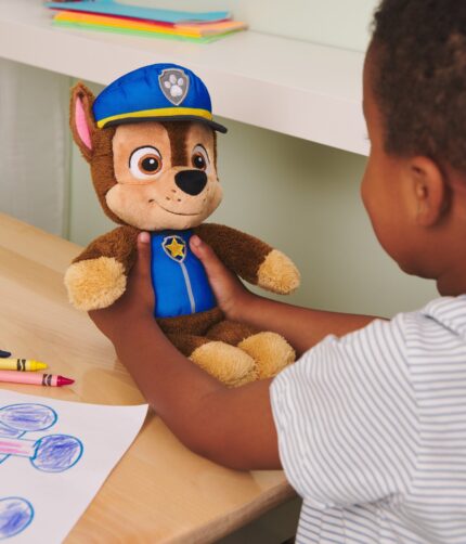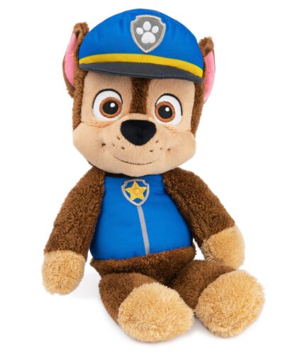 A cuddly PAW Patrol plush featuring Chase, designed for young children, with a floppy body and oversized paws.
