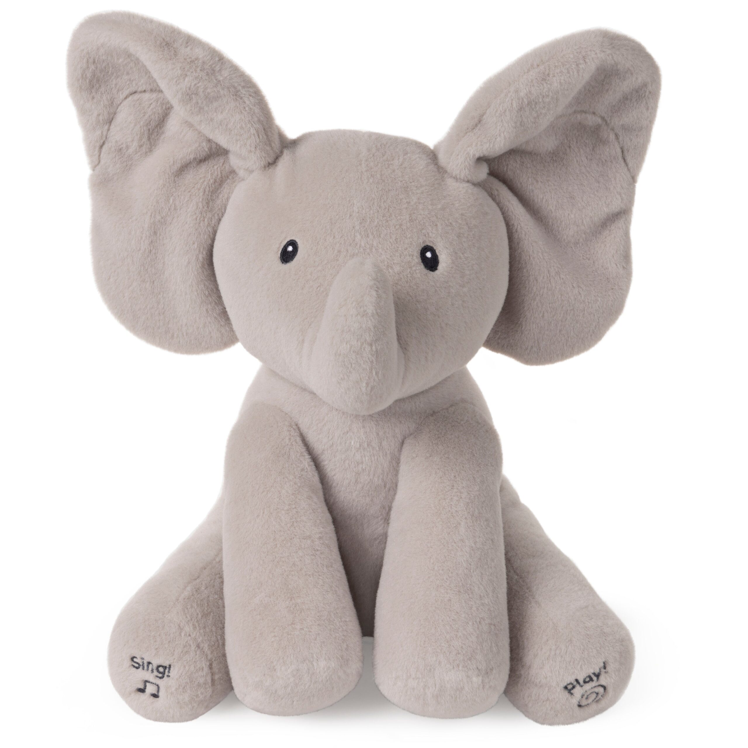 Flappy is an adorable, soft gray singing elephant with two different play modes to engage and entertain baby, making playtime more exciting as they embrace tactile play. This Baby GUND favorite sings in a cute child’s voice and plays an interactive game of peek-a-boo with the press of a button. Press Flappy’s left foot to engage him in an interactive game of peek-a-boo, where Flappy hides behind his soft, oversized ears. Press his right foot to sing along to a playful song in a cute child’s voice, while his ears flap in time to the rhythm! Flappy also now features volume control for a more comfortable customized play session. Users can adjust volumes by holding either foot for three seconds. Hug and play along with the one and only Flappy the Elephant!