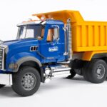 The unbelievably realistic driver’s cab with opening doors, a tilting hood that allows a view of the engine block, folding rearview mirrors, and numerous chrome-effect attachments. The hydraulics allow the dump truck to be tilted, and the tailgate opens. The Mack Granite truck can be used both indoors and outdoors.
