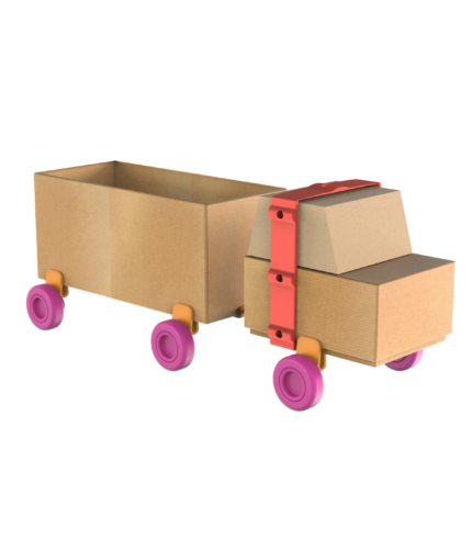 Wooden play set with a truck that picks up and delivers four colorful cars. Easy-load and lower ramps provide two levels for the vehicles.