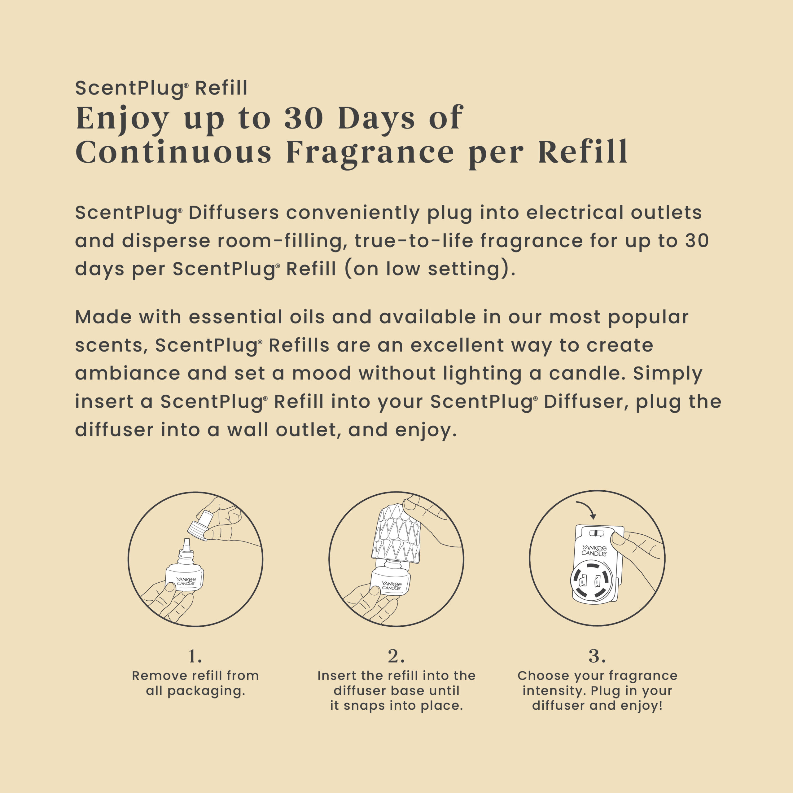 Come home to an inviting combination of personal style and continuous fragrance. Just insert this fragrance refill into a decorative ScentPlug® Fragrance Diffuser, plug it in, and you’ll enjoy room-filling fragrance for up to 30 days. To use, simply remove the refill’s cap and slide the bottle into the ScentPlug® Base until it snaps into place. Rotate the base’s plug to match your outlet, keeping the ScentPlug® Fragrance Refill upright. When the oil disappears, it’s time to replace!