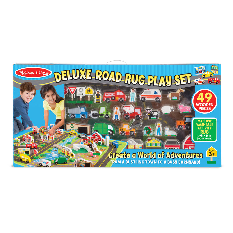 Create a world of adventures, from a bustling town to a busy barnyard! This deluxe play set includes a soft and durable machine-washable activity rug, and 49 wooden play pieces to bring it to life. Pieces include construction vehicles, cars and trucks, play people, buildings, farm equipment and structures, animals, traffic signs, and more! The soft 39-inch by 36-inch (100 cm by 91 cm) rug with skid-proof backing and reinforced border binding has room for multiple kids to play.