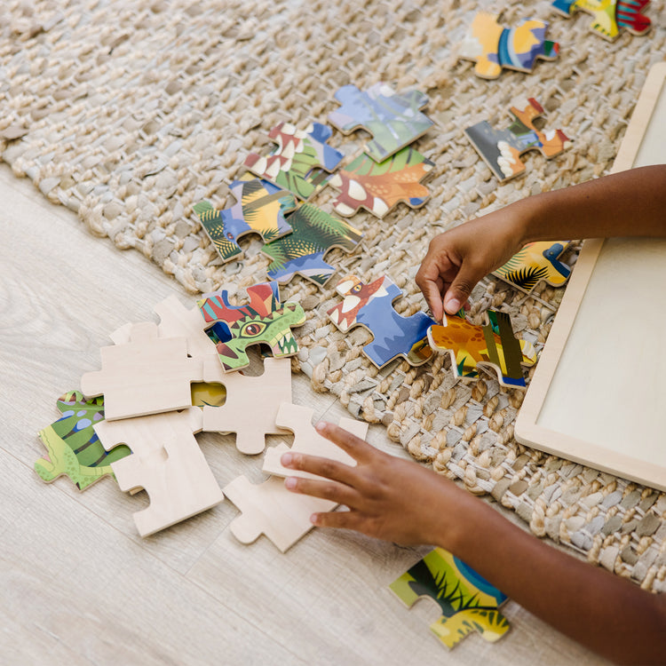 24-piece wooden jigsaw puzzle featuring an exciting illustration of dinosaurs in their natural habitat. Packaged in a sturdy wooden tray for puzzle building and storage, it encourages problem-solving and fine motor development.