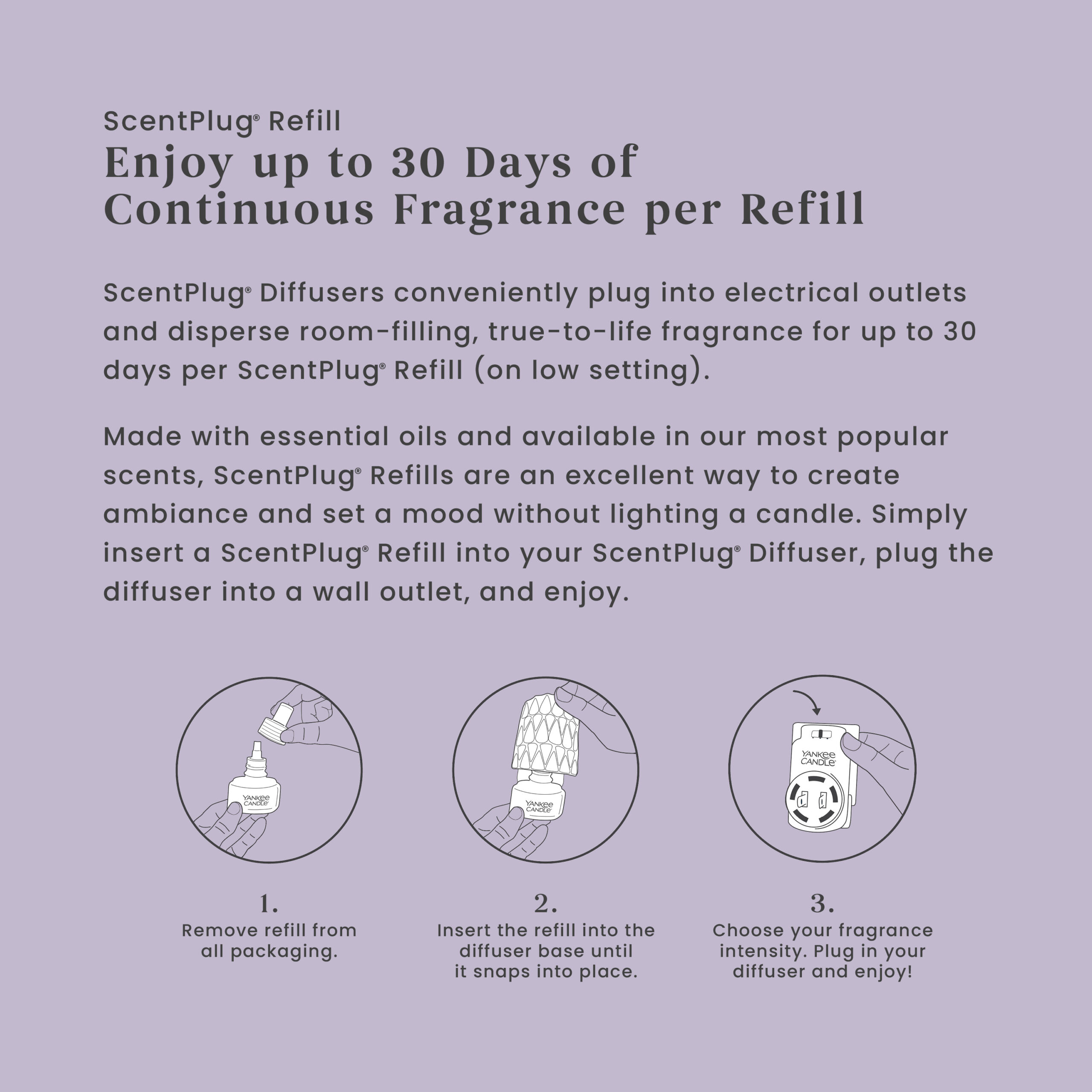 Come home to an inviting combination of personal style and continuous fragrance. Just insert this fragrance refill into a decorative ScentPlug® Fragrance Diffuser, plug it in, and you’ll enjoy room-filling fragrance for up to 30 days. To use, simply remove the refill’s cap and slide the bottle into the ScentPlug® Base until it snaps into place. Rotate the base’s plug to match your outlet, keeping the ScentPlug® Fragrance Refill upright. When the oil disappears, it’s time to replace!