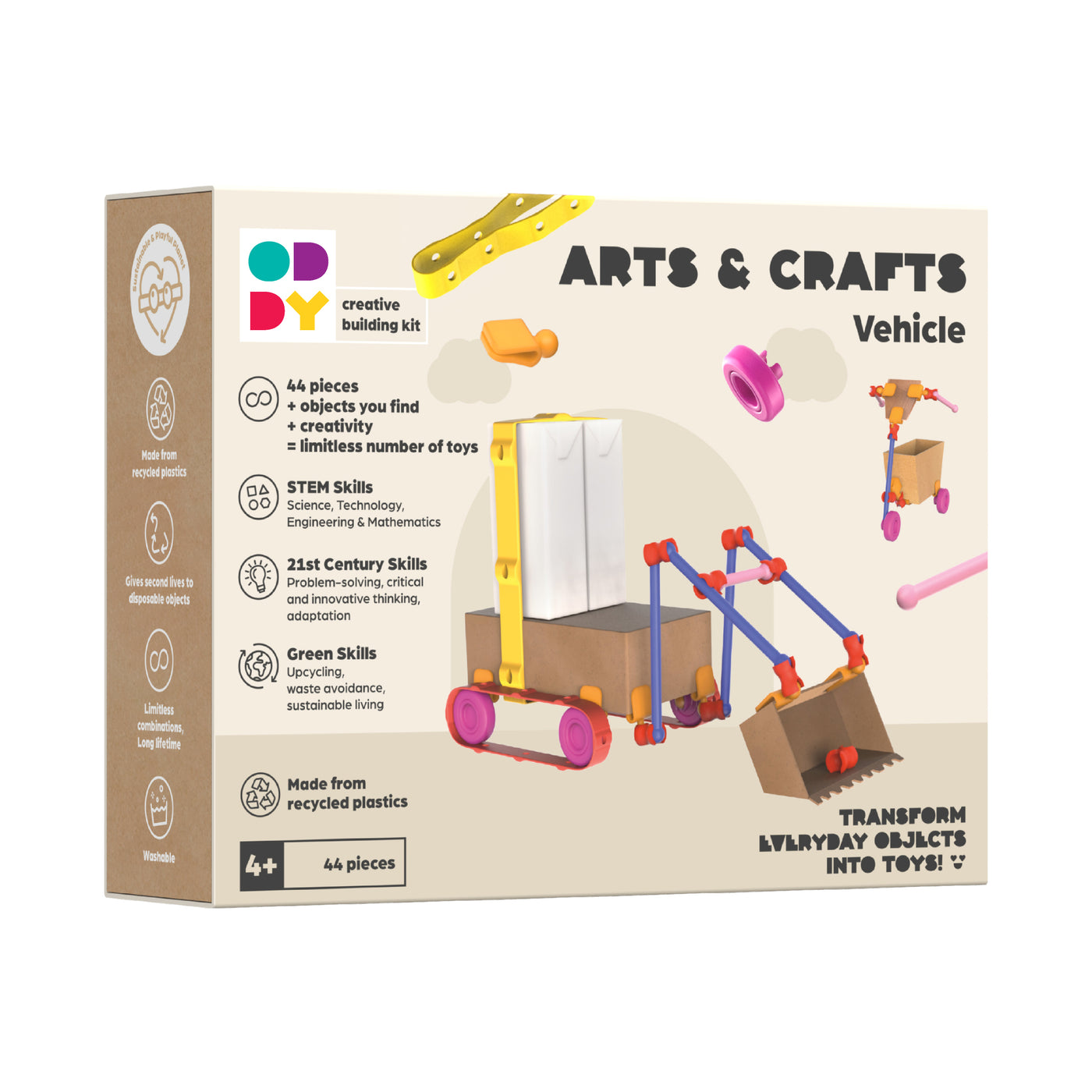 ODDY Creative Building Kits let kids transform everyday objects into toys! With this ODDY 44 piece Arts & Crafts Vehicle Building Kit, kids can use common household items such as boxes, cardboard tubes, and more to build fun vehicle toys, and much more! NOTE: Household items not included. This set includes 44 pieces that can interlock and connect and integrate with common objects to form fun and creative vehicle toys of all kinds. Made from recycled materials, these eco-friendly toys help spark imagination and practice STEM and STEAM skills. Packaged dimensions: approximately 8 x 6 x 2 inches. Suitable for ages 6 years and up.