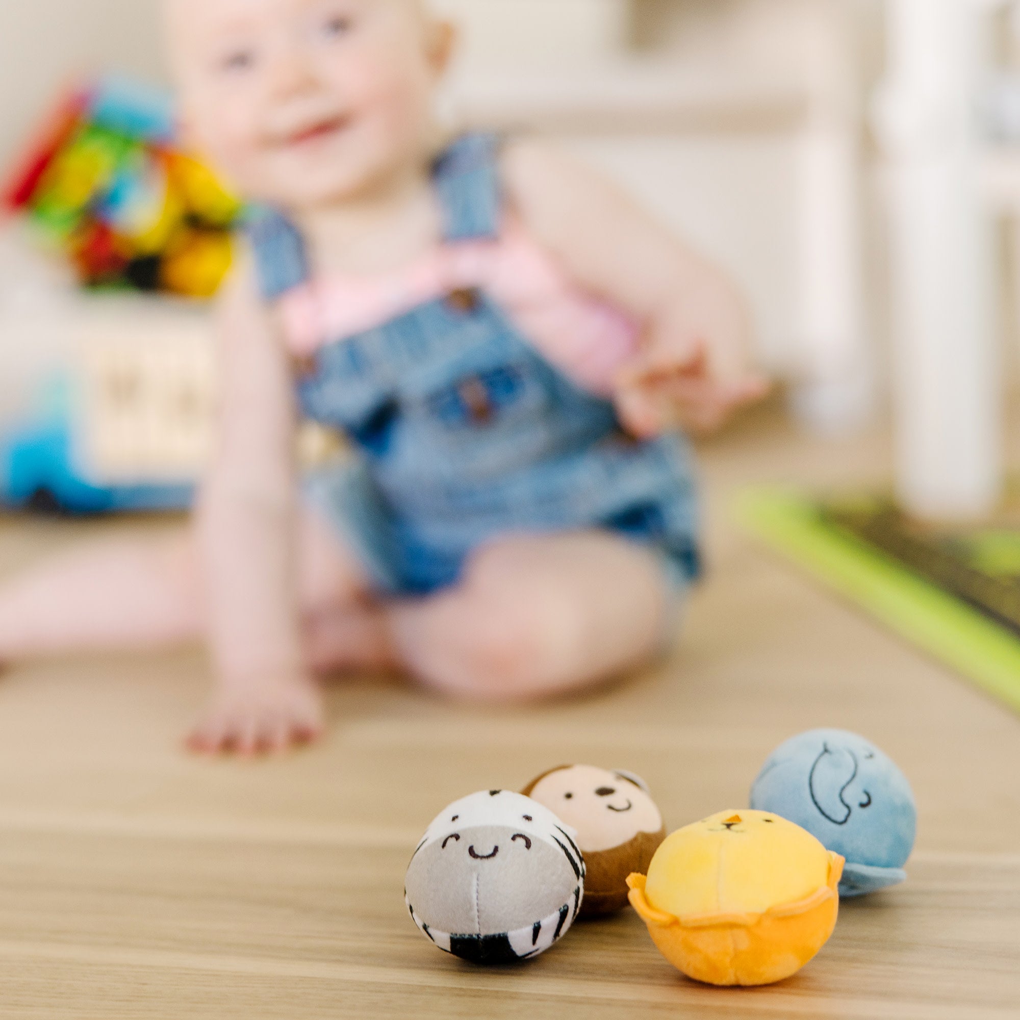 Get playtime and developmental skills rolling with Safari Friends Rollables—adorably round characters that are firm enough to roll but soft enough to squeeze! Inspire imaginative safari adventures through kinetic play with four wild animal Rollables that store conveniently in the package: the mischievous monkey, striped zebra, gentle elephant, and friendly lion with chime. Compatible with other Rollables play sets. Rollables are an engaging way to encourage development of important sensory and fine motor skills. Melissa & Doug infant and toddler toys inspire “a-ha!” moments of discovery. Adorable, diverse characters and a variety of fun shapes and textures encourage exploratory, skill-building play.