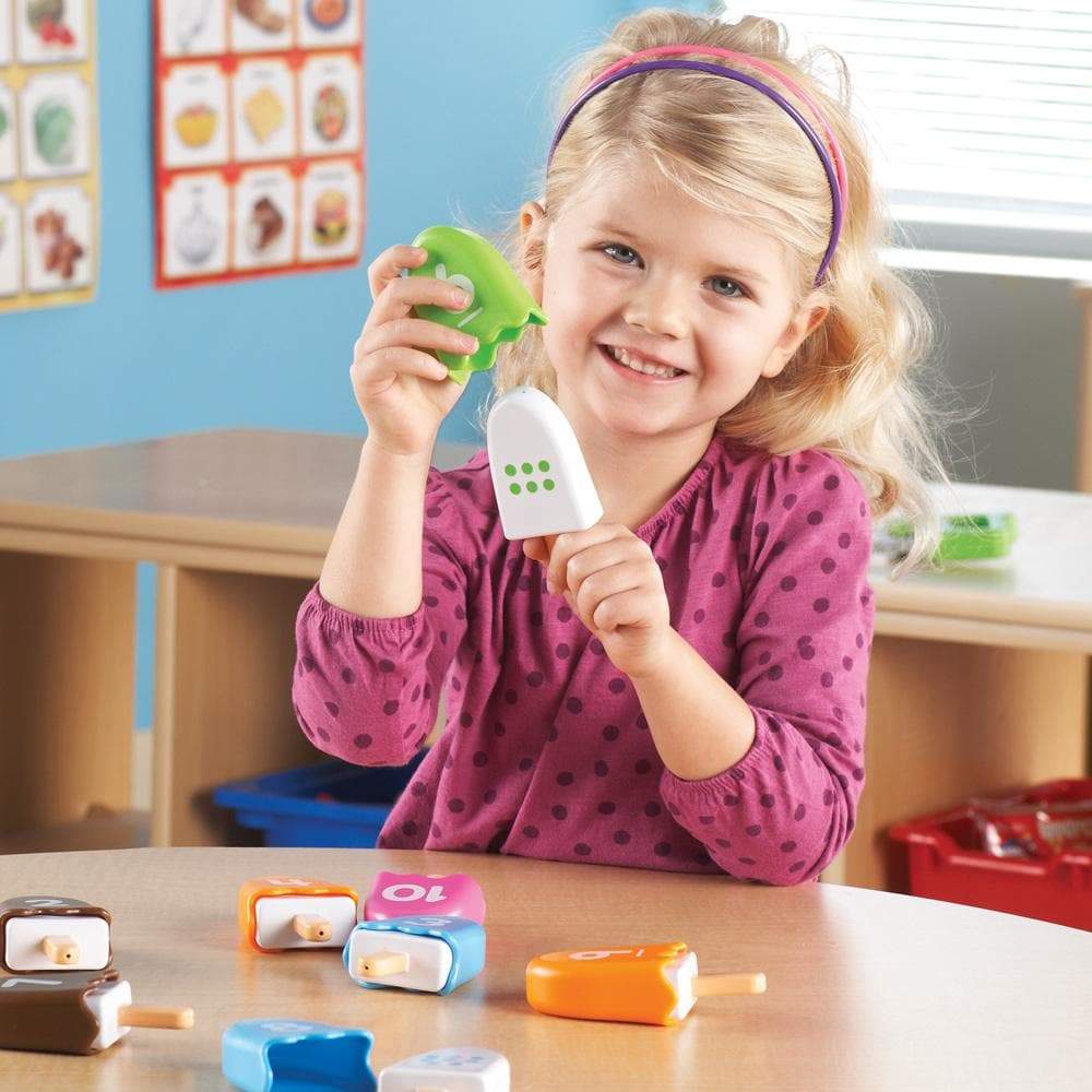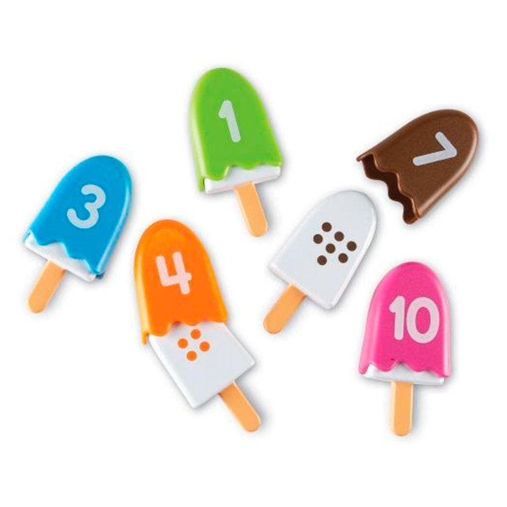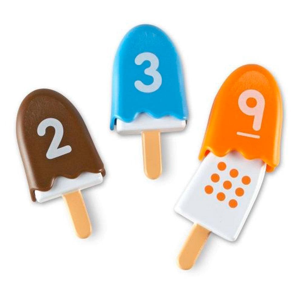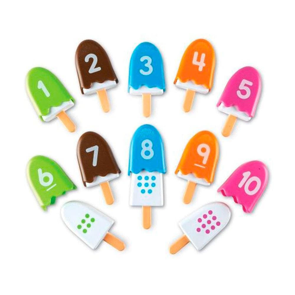 These colorful plastic pops are great for teaching color matching skills and practicing number recognition (1 through 10). The set includes 10 plastic pops on sticks with ten colorful shells that cover them. Each shell has a number between one and ten on it, and each pop has a series of colored dots. The color and number of the dots matches the corresponding numbered shell color.