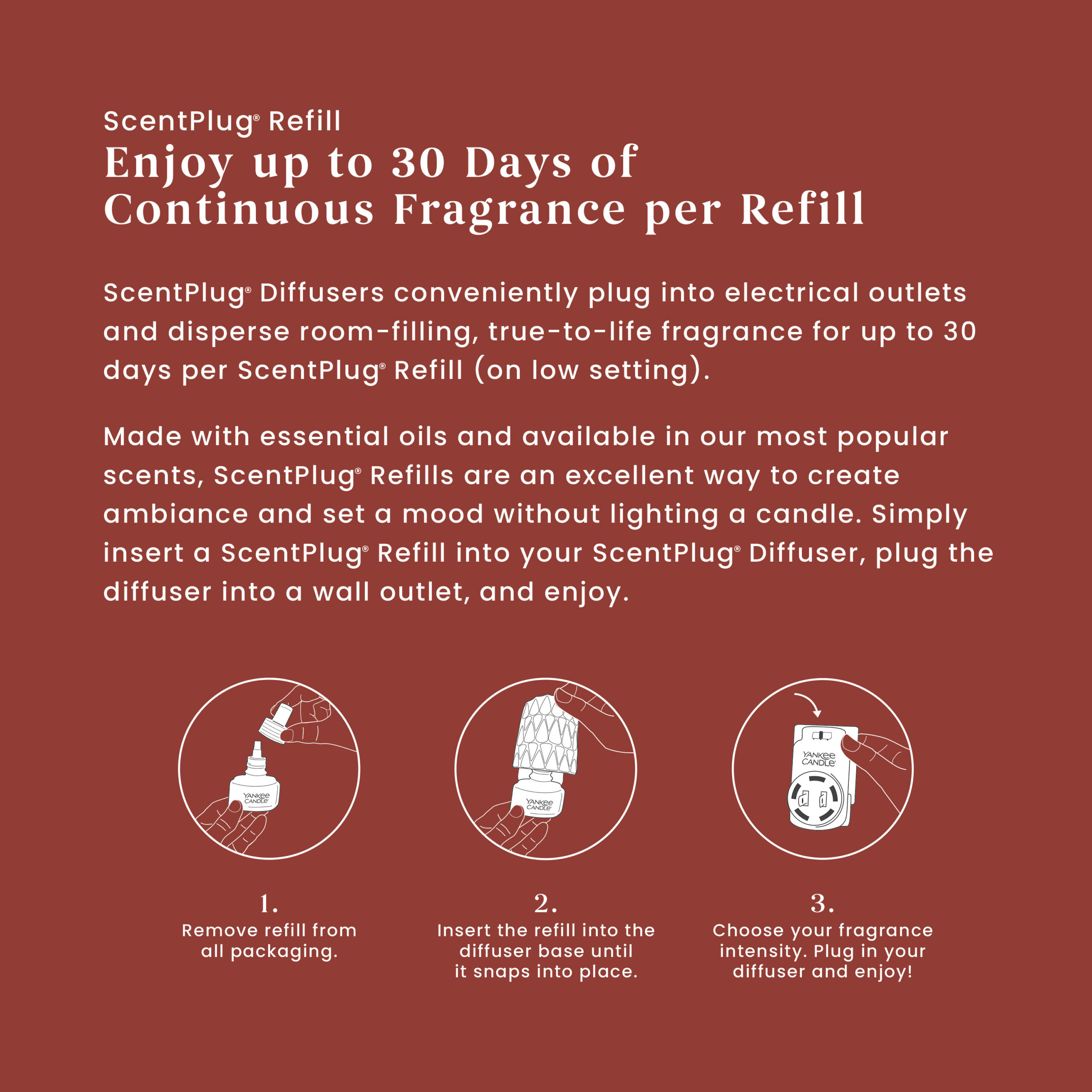 Come home to an inviting combination of personal style and continuous fragrance. Just insert this fragrance refill into a decorative ScentPlugĀ® Fragrance Diffuser, plug it in, and you’ll enjoy room-filling fragrance for up to 30 days.
