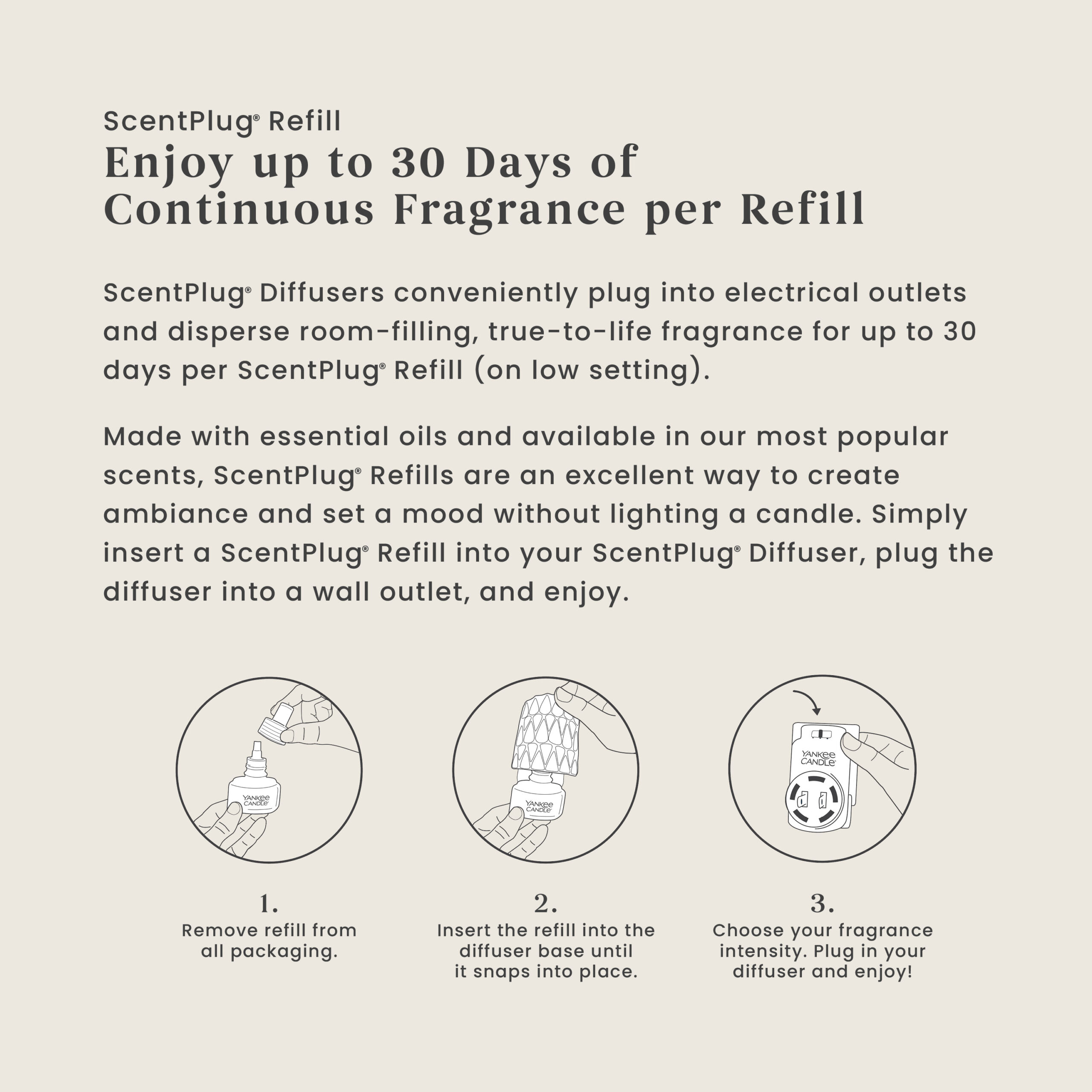 Come home to an inviting combination of personal style and continuous fragrance. Just insert this fragrance refill into a decorative ScentPlug® Fragrance Diffuser, plug it in, and you’ll enjoy room-filling fragrance for up to 30 days. To use, simply remove the refill’s cap and slide the bottle into the ScentPlug® Base until it snaps into place. Rotate the base’s plug to match your outlet, keeping the ScentPlug® Fragrance Refill upright. When the oil disappears, it’s time to replace!