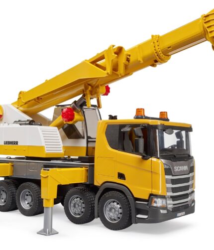 High-quality Bruder toy featuring a Scania Super 560R crane truck with light and sound functionalities; ideal for indoor and outdoor play for children aged 4 and above.